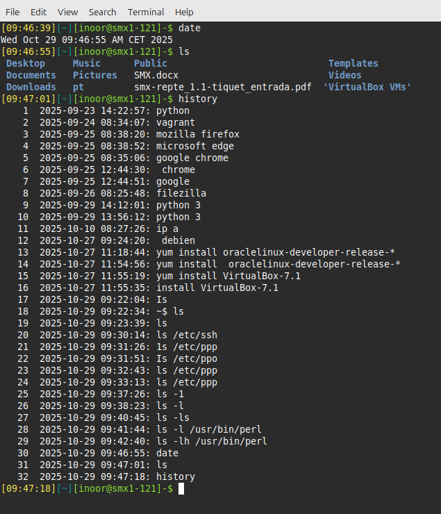 When a command is executed in the terminal, it is stored in a history list. This is designed to make it easy to execute the same command, later eliminating the need to retype the entire command.To view the history list of a terminal, use the history command: