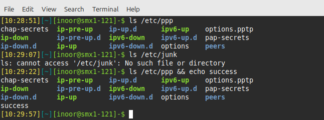 In the following example, the first command succeeds because the /etc/ppp directory exists and is accessible while the second command fails because there is no /junk directory:To use the success or failure of the ls command in conjunction with && execute commands like the following: