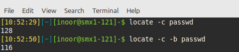 In many cases, it is helpful to start by finding out how many files match. Do this by using the -c option to the locate command.To limit the output produced by the locate command use the -b option. This option only includes listings that have the search term in the basename of the filename. The basename is the portion of the filename not including the directory names.
