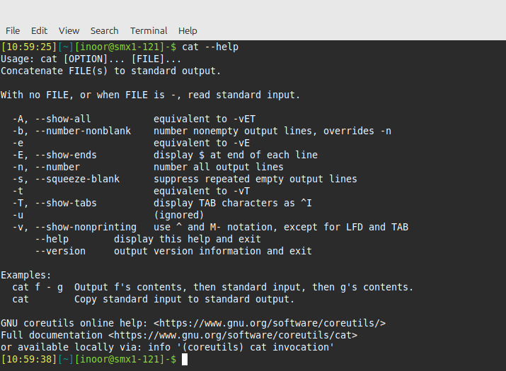 Many commands will provide basic information, by simply using the cat --help option to the command. This option is useful to learn the basic usage of a command quickly without leaving the command line
