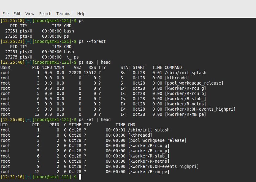 By default, the ps command only shows the current processes running in the current shell. Ironically, even though you are trying to obtain information about processes, the ps command includes itself in the output.If you run ps with the option --forest, then, similar to the pstree command, it shows lines indicating the parent and child relationship.To be able to view all processes on the system execute either the ps aux command or the ps -ef command: