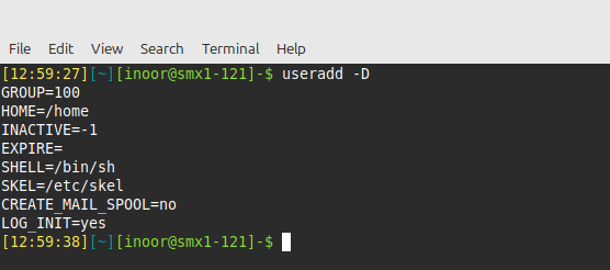 The -D option to the useradd command allows you to view or change some of the default values used by the useradd command. The values shown by useradd -D can also be viewed or updated by manipulating the /etc/default/useradd file: