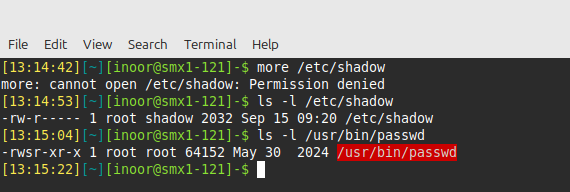 his permission is set on a handful of system utilities so that they can be run by normal users, but executed with the permissions of root, providing access to system files that the normal user doesn’t normally have access to.Consider the following scenario in which the user inoor attempts to view the contents of the /etc/shadow file.You can see this permission also set by running the ls -l command: