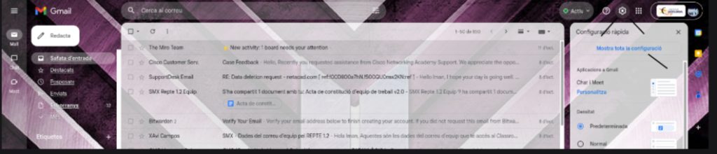 Per configurar la redirecció al correu corporatiu he anat a Gmail, he fet clic a la icona de l’engranatge i he seleccionat “Mostra tota la configuració.