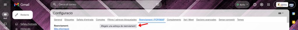 A l’apartat de “Reenviament” fem click a “Afegeix una adreça de reenviament”.