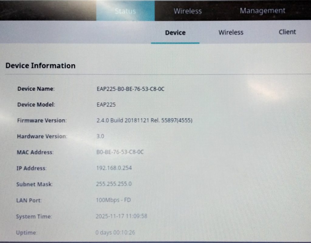 A la pestanya Status > Device (Estat > Dispositiu), podeu revisar la informació actual del dispositiu. Aquesta pàgina confirma el model, el firmware, la versió de hardware i l’adreça IP actual del Punt d’Accés (192.168.0.254).