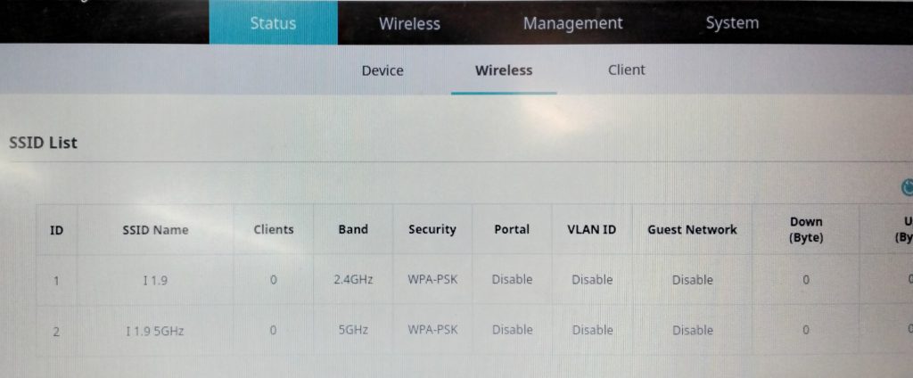 Finalment, a la pàgina Status > Wireless (Estat > Sense Fils), verifiqueu la llista d’SSID. Això confirma que les vostres noves xarxes (I1.9 i I1.9 5GHz) estan actives, utilitzant seguretat WPA-PSK i llestes per a connexions de clients.