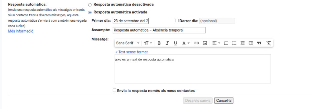 En l’apartat general, he baixat fins arribar a l’opció de “Resposta automatica”.