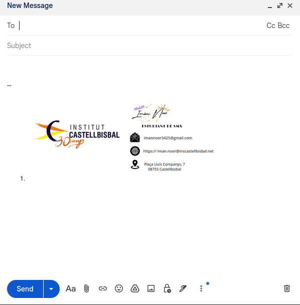 Per crear la meva signatura digital vaig utilitzar l’eina Canva, ja que permet combinar text, imatges i elements decoratius d’una manera senzilla i professional. A partir d’una plantilla en blanc, vaig dissenyar la meva signatura incorporant diferents estils tipogràfics i elements gràfics.