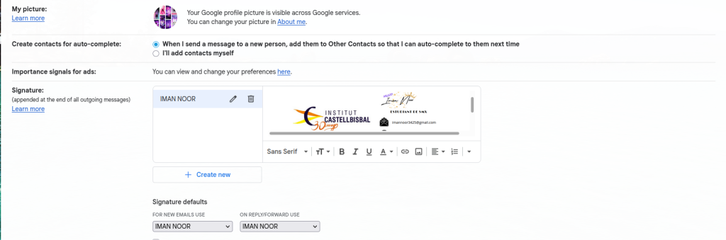 - Crear una nova signatura i afegir la imatge PNG creada a Canva.