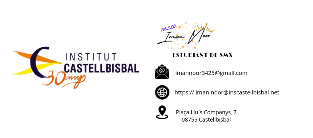 1- Nom i cognoms (“Iman Noor”): escrit amb una tipografia manuscrita per donar un aspecte elegant i personal.