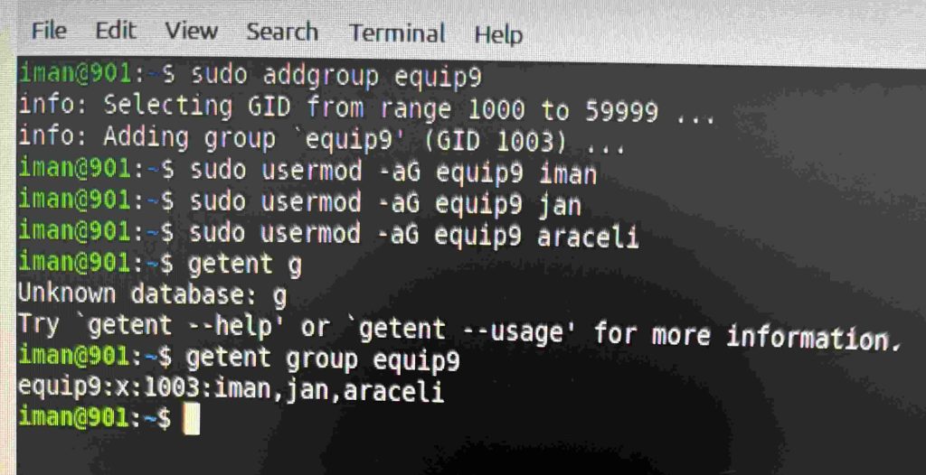 2- Creació del grup: He utilitzat la comanda sudo addgroup [nom_del_grup] per crear un nou grup al sistema. Exemple: sudo addgroup equip9