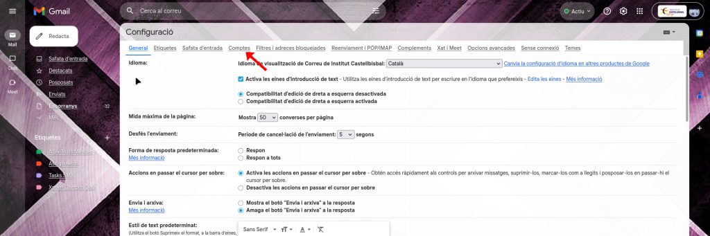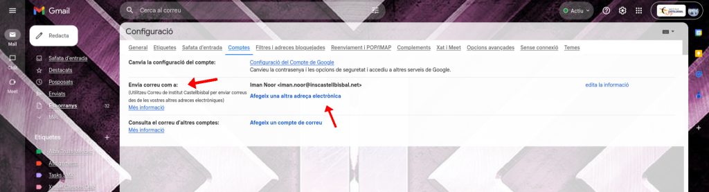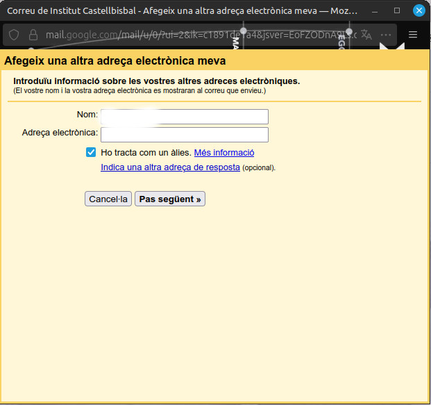 Anem al apartat de ”Envia correu com a”.Cliquem a “Afegir un altre compte”