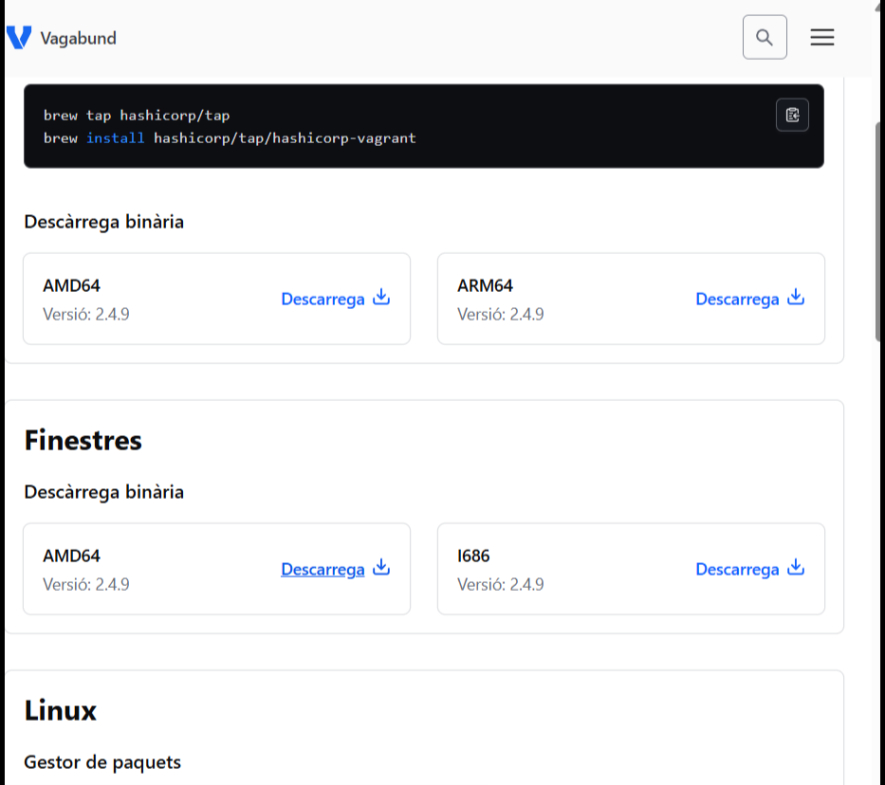 He anat al Web oficial de Vagrant per descarregar la versió que necessito. Un cop descarregat, he llegit els termes i condicions de ús, els he acceptat i faig clic al botó Instal·lar.