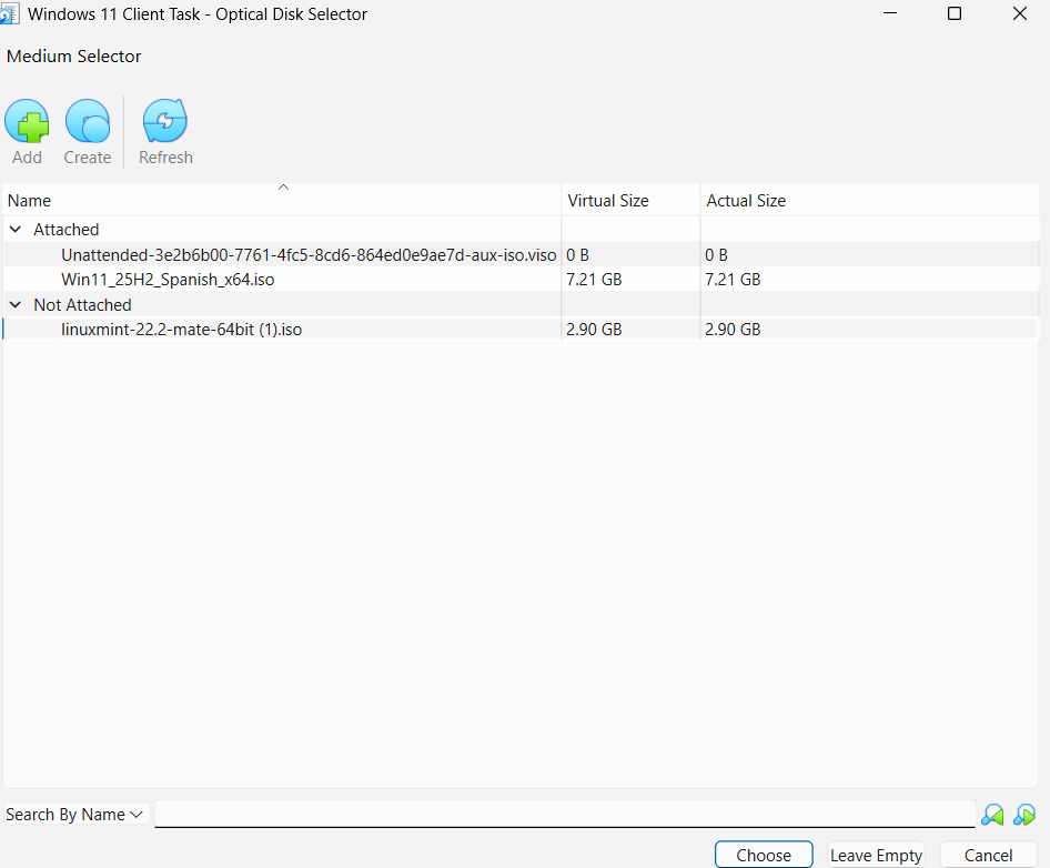 He seleccionat el fitxer linuxmint-22.2-mate-64bit (1).iso de la meva carpeta de descàrregues.Finalment, he premut Selecciona (Choose) i D’acord (OK) per confirmar que la ISO aparegui sota el controlador SATA.