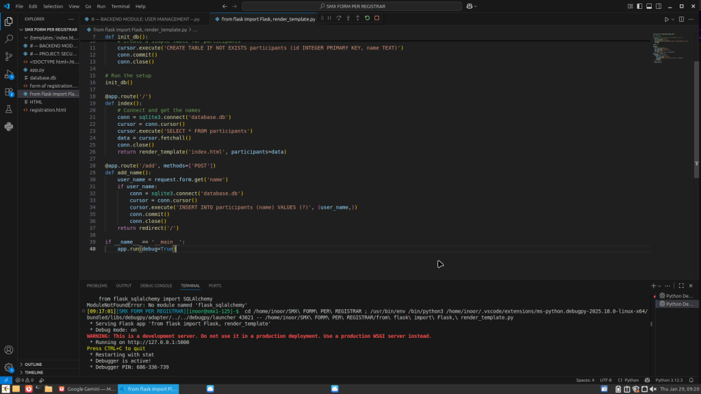Inicialment, funcionava perquè el portàtil de l’escola no permetia instal·lar flask-sqlalchemy. L’error era: ModuleNotFoundError.