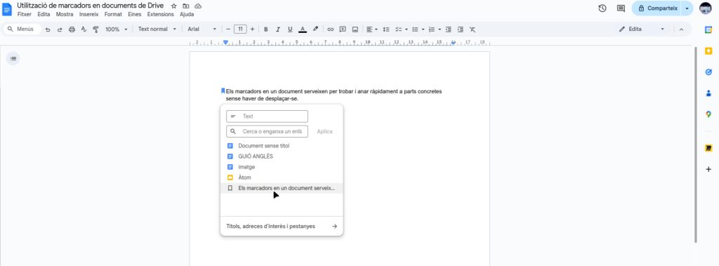 Per enllaçar a aquest marcador, seleccionem “Inserir” > “Enllaç” > “Marcador”. I seleccionem el marcador.